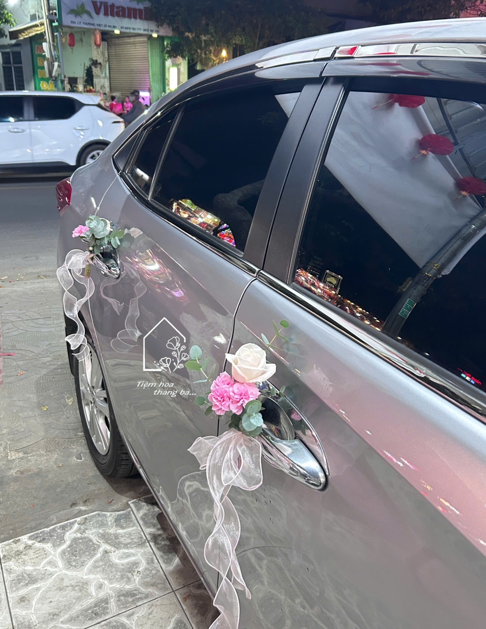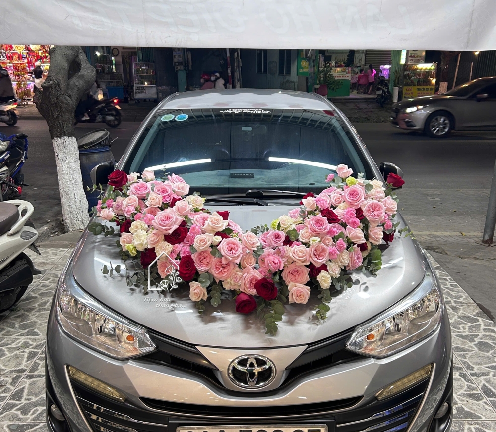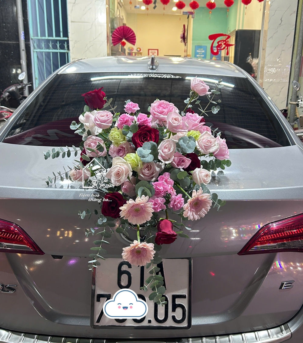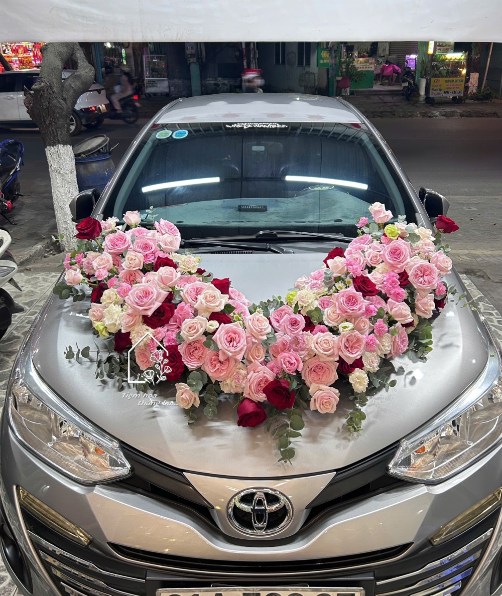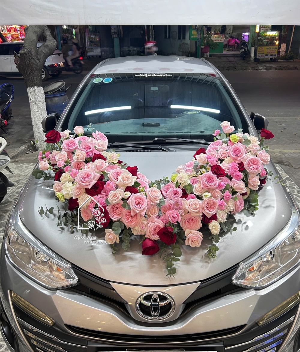 Tone màu hồng – đỏ được phối khéo léo, giúp tổng thể vừa ngọt ngào, vừa nổi bật trên nền xe sáng màu, cực kỳ ăn ảnh khi chụp hình rước dâu, chụp cổng hoa và album cưới.